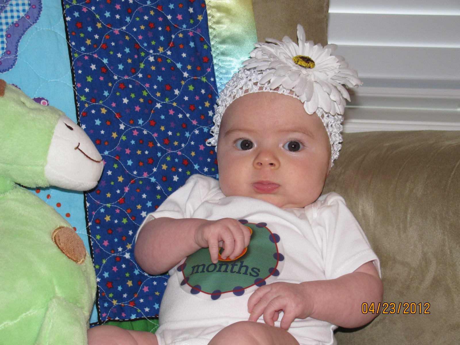 She has also turned a corner this month in that she is much easier to put down. She is content to sit and watch things now, where before she wanted to be held all.the.time. So that has been a big help! She is much less fussy and is smiling and "talking" a ton these days which I just love!! She has also found her hands and they are constantly in her mouth. The drooling is out of control these days too-she'll soak your arm in no time!